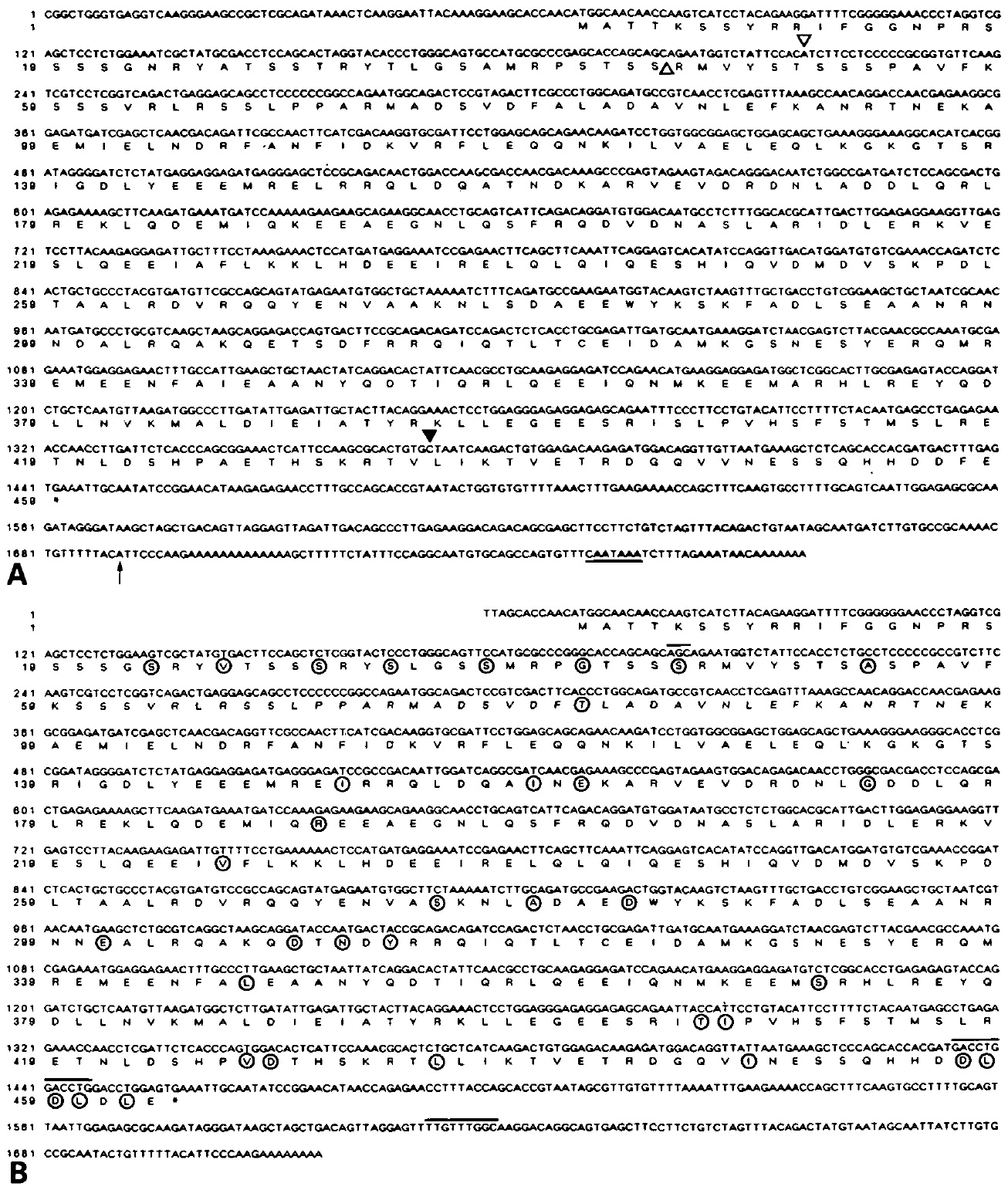 Fig. 4. Nucleotide sequence and deduced amino acid sequence of cloned Xenopus laevis vimentins. (A) Combined sequence of clones pXenViml, containing nucleotides 1-1688 (indicated by an arrow), and pXenVim3, containing nucleotide 1367 (indicated by an arrowhead) to the 3'-end of the clone. The clones are identical in the overlapping region. Differences found in the pXenVim2 sequence are indicated by an upward triangle (insertion of an AGC triplet coding for serine) and a downward triangle (substitution of T for C without change of the coded amino acid). (B) Sequence of clone pXenVim4. Major differences of the nucleotide sequence to pXenViml are overlined and the amino acid changes are encircled. |