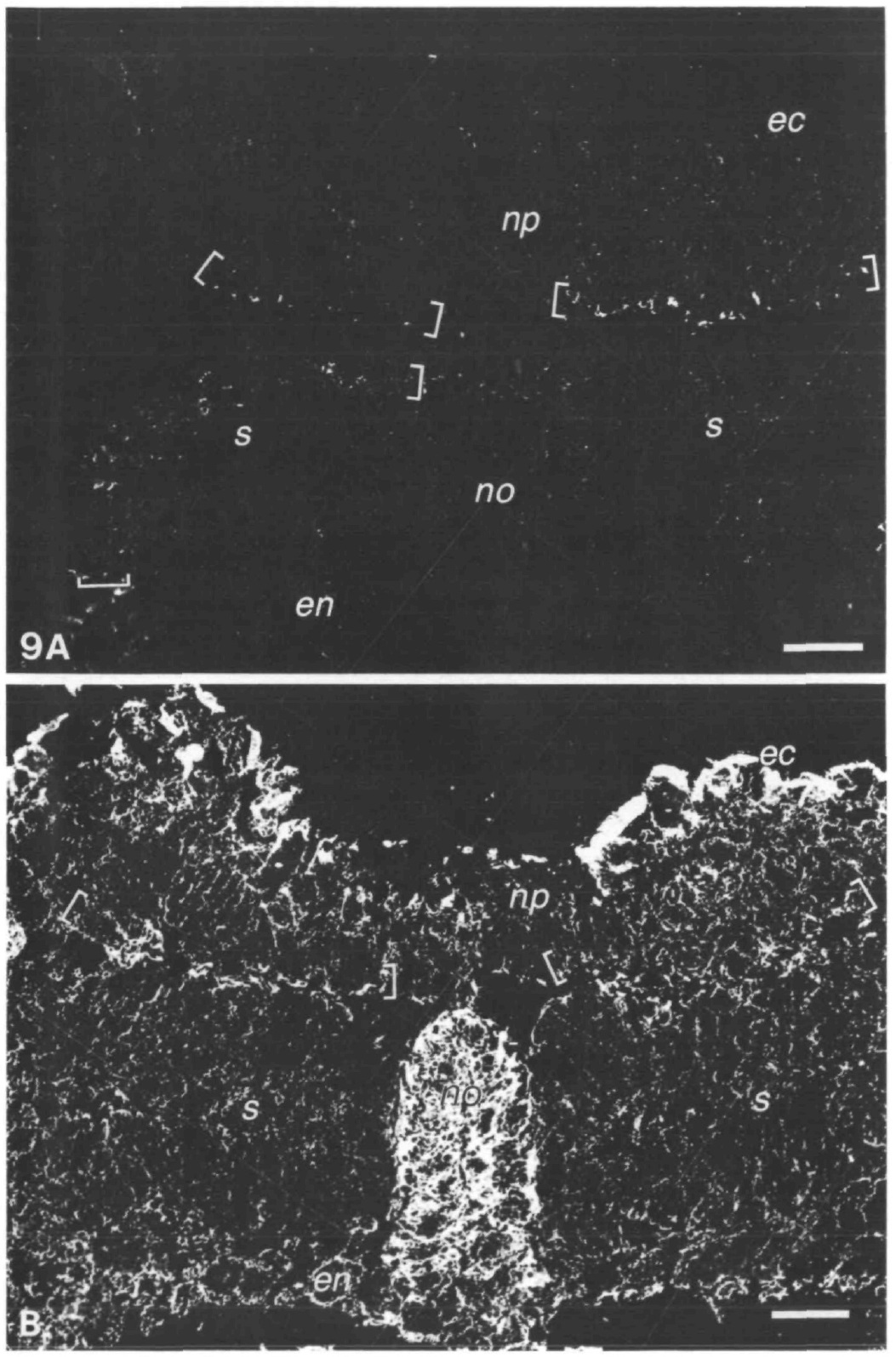 Fig. 9. Survey picture montage of immunofluorescence micrographs of sections through snap-frozen stage- 14 embryos (neural plate stage) of Xenopus laevis (whole embryos were sectioned and documented in overlapping micrographs). (A) Reaction of monoclonal antibody VIM-3B4, showing positive reaction only in a distinct and thin mesenchymal cell layer (demarcated by brackets) whereas the neural plate (np), notochord (no) and somites (s) are negative. ec, ectoderm; en, endoderm. (B) Reaction of monoclonal cytokeratin antibody lu-5, showing an area corresponding to that shown in A in a step section. Note that all cell layers are positive for cytokeratins. In particular, the notochord (no) and the ectoderm (ec) are intensely stained. The mesenchymal cell layer (brackets) shown to be positive for vimentin in A, is also positive for cytokeratin. Symbols are as in A. Bars, 50,um. |