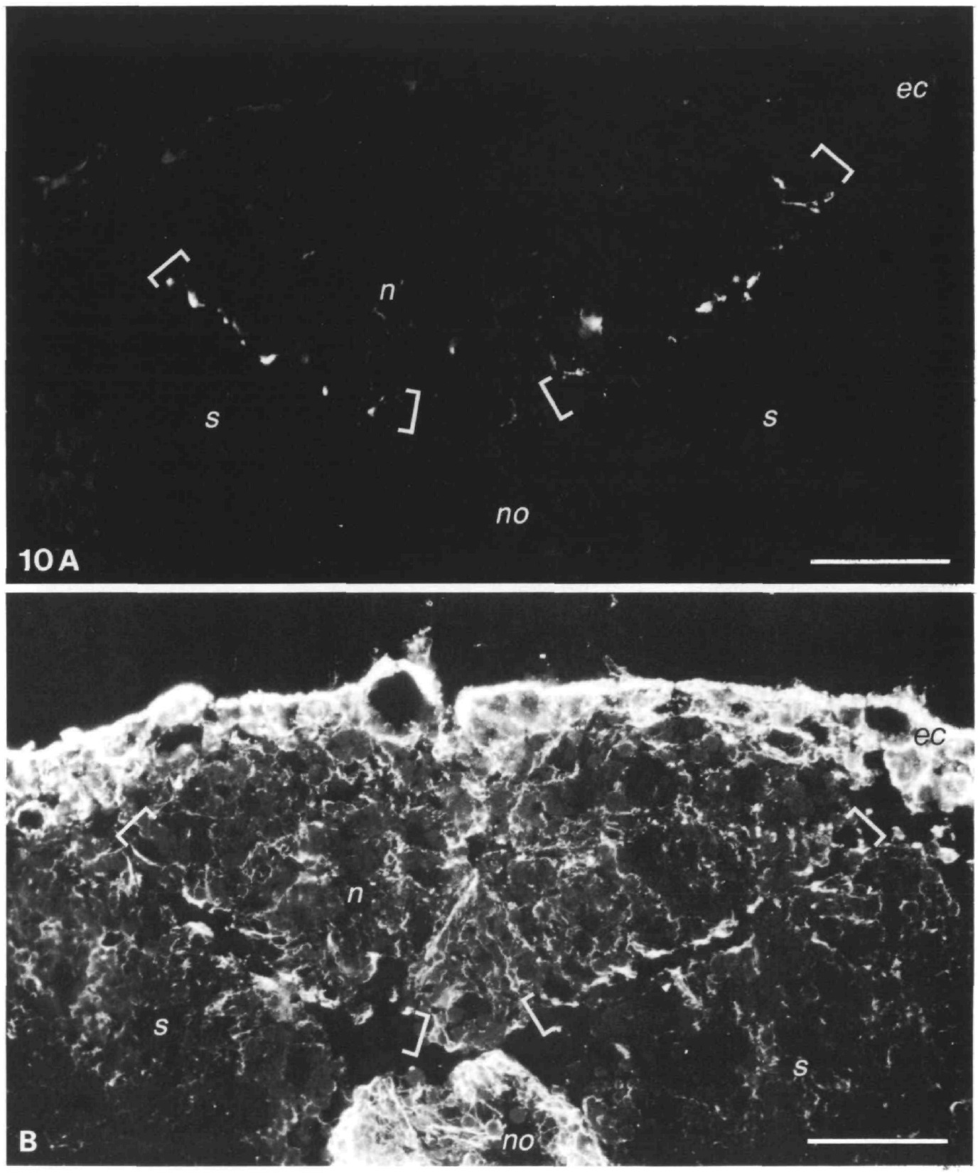 Fig. 10. Immunofluorescence microscopy performed on cryostat sections of snap-frozen stage-18 (neural groove stage) embryos of Xenopus laevis using monoclonal antibodies to vimentin (A) and cytokeratin (B). (A) Immunofluorescence micrograph of the neural groove region of a stage-18 embryo, showing the reaction of monoclonal antibody VIM-3B4. The reaction is restricted to a single cell layer (brackets) beneath the neural groove (n). All other cell layers are negative. ec, ectoderm; s, somite; n, neural groove; no, notochord. (B) Reaction of monoclonal antibody lu-5, on a step section of the same region shown in A. Note that all cell layers show a positive reaction, the notochord (no) and the ectoderm (ec) being brightly stained and that the thin layer of cells shown to be positive for vimentin in A is also positive for cytokeratin (brackets). Symbols are as in A. Bars, 50 um. |
