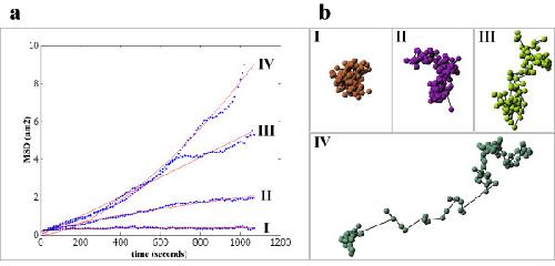 Figure 4. Different classes of mean square displacement of tracked nuclear vimentin particles. a) Mean squared displacement (MSD) of four representative modes of particle mobility (x-axis: acquisition time in seconds; y-axis: MSD). Roman numbers: I) confined diffusion; II) obstructed diffusion; III) normal diffusion; IV) directed motion (The numeration refers to indicated trajectories in Figure 3a). b) The four different mobility classes are represented by particle trajectories. The trajectories correlate to the numbers indicated by arrows in Figure 3a.