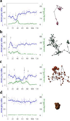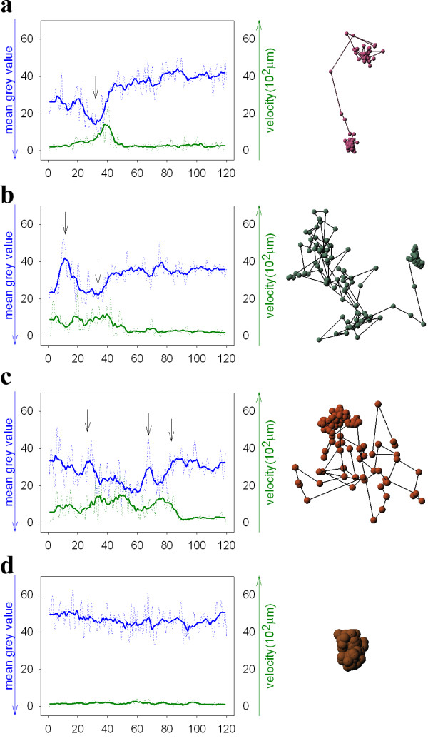 Figure 8. Correlation plots between mean grey values (green line) of chromatin densities and particle velocity (blue line) over a time range of 20 minutes. Arrows indicate significant changes in intensity and particle velocity. Red: NLS-GFP-vimentin; green: Hoechst 33342 stain.