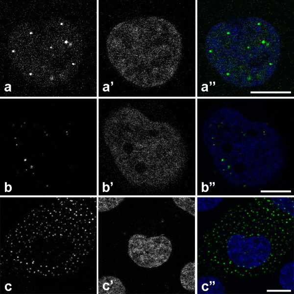 Figure 1. A) Nucleus of a SW13 cell stably transfected with an expression plasmid encoding for GFP-NLS-vimentin. B) SW13 cell nucleus containing microinjected 100 nm-microspheres. C) SW13 cell transfected with GFP-vimentin showing cytoplasmic particle formation. A', B', C'): Corresponding Hoechst 33342 chromatin stain, A, B, C) superimposed images.