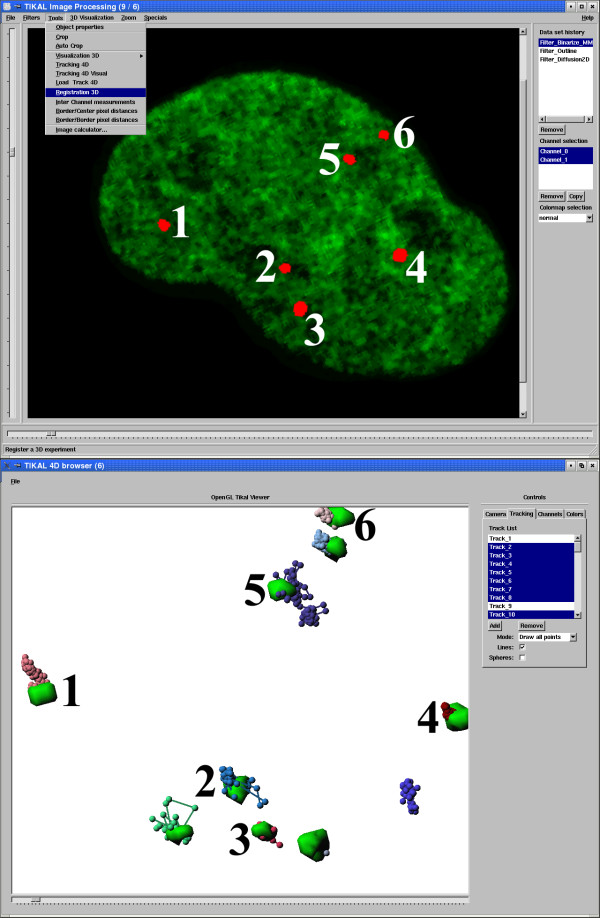 Figure 2. Screen shot of the image processing platform TIKAL. (top) Image shows a sample two-dimensional section through a nucleus with binarized nuclear particles (red) counterstained with Hoechst 33342 stain (green). Pull down menu exemplifies different tools for quantitative analysis integrated into TIKAL. Numbers indicate different nuclear particles reconstructed by 3D isosurface reconstruction (bottom). Computed tracks of nuclear bodies over time are displayed as spheres on a string in the multi-dimensional scene viewer.
