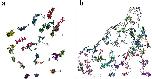Figure 3. 4-D visualization of vimentin particle trajectories a) in the nucleus and b) the cytoplasm. Each color represents an individual vimentin body. The respective centers of masses are indicated as spheres. Tracks are symbolized by interconnecting lines. Arrows indicate the different kinds of diffusion (see Figure 4a). Major types of movement are indicated: I) confined diffusion; II) obstructed diffusion; III) normal diffusion; IV) directed motion.