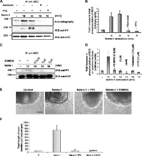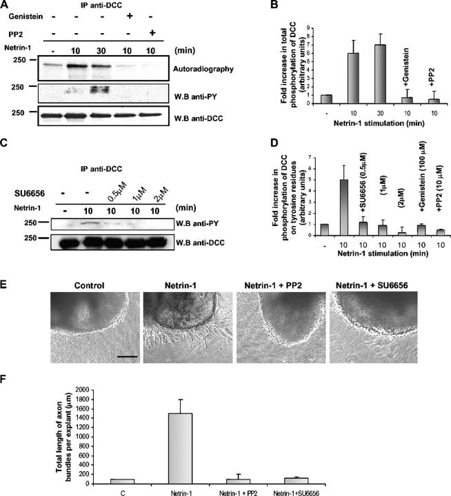 Figure 2. DCC phosphorylation on tyrosine residues is Src family kinase dependent and is critical for Netrin-1–mediated axon outgrowth. (A) Labeling of CN was or was not followed by stimulation with Netrin-1 for 10 or 30 min. The neurons were also treated or not, for 2 h, with either genistein or PP2 before a 10-min Netrin-1 stimulation. (C) Nonlabeled rat CN were also treated for 2 h with different concentrations of SU6656 before a 10-min Netrin-1 stimulation. (A and C) DCC was immunoprecipitated (IP) from the cell lysates and the products were analyzed by SDS-PAGE and autoradiography. The membrane was immunoblotted with anti-pY and anti-DCC antibodies to analyze the total amount of DCC. (B) Quantitative analysis of the total DCC phosphorylation after genistein or PP2 treatments (n = 4). (D) Quantitative analysis of DCC phosphorylation on tyrosine residues after genistein, PP2, or SU6656 treatments. (B and D) Error bars represent SD. (E) E13 rat dorsal spinal cord explants were cultured for 36 h, alone (control), in the presence of Netrin-1, or with both Netrin-1 and either PP2 or SU6656. Bar, 100 μm. (F) Quantification of the total length of axon bundles per explant in micrometers. Error bars represent SD. |