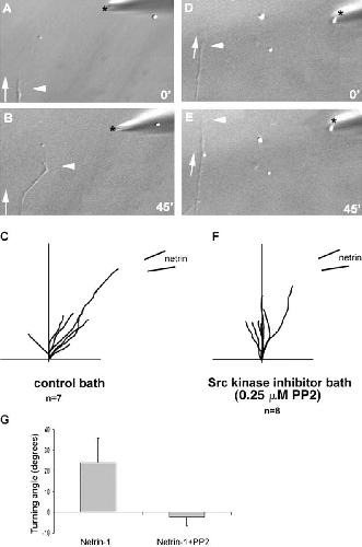 Figure 3. Inhibition of Src family kinases abolishes Netrin-1âinduced turning response of RGC growth cones. (A, B, D, and E) X. laevis RGC growth cones extending from a 24-h stage 24 explant culture. Pulsatile ejection of Netrin-1 from a pipette (*) with a 0.5â1.0-μm opening was used to set up a concentration gradient next to an extending RGC growth cone (arrowheads). (A and D) Trajectories of growth cones before applying the pipette solution (arrows). (B and E) Growth cones (arrows) 45 min after continuous exposure to the Netrin-1 concentration gradient. The growth cone in the control bath (A and B) turned toward the Netrin-1 source, whereas the growth cone bathed in 0.25 μM of Src kinase inhibitor PP2 (D and E) ignored the Netrin-1 source. (C and F) Superimposed neurite trajectories of growth cones exposed to Netrin-1 source in a control medium (C) and growth cones exposed to Netrin-1 in the presence of PP2 (F). (G) Representation of the mean turning angles of the growth cones in C and F (P < 0.05; unpaired two-tailed t test). Error bars represent SD. |