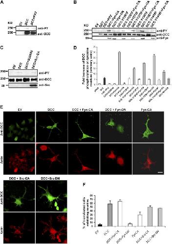 Figure 5. Fyn tyrosine kinase regulates the phosphorylation of DCC and is critical for DCC-induced neurite outgrowth in N1E-115 cells. (A) N1E-115 cells were transfected with empty vector (EV) or pRK5-DCC (DCC). Cells expressing DCC were treated with PP2. DCC was immunoprecipitated from the lysates, and the total amount of DCC was determined using anti-DCC antibodies. Anti-pY antibodies were used to show the level of DCC phosphorylation on tyrosines. (B) The empty vector (EV), DCC, DCC-Y1261F, DCC-Y1272F, DCC-Y1361F, or DCC-Y1418F constructs were transfected either alone or together with Fyn-CA, in N1E-115 cells. Cells expressing DCC were treated with the Src kinase inhibitor PP2. DCC was also cotransfected with Fyn-DN. The expression of these proteins was analyzed by Western blot using anti-DCC and anti-Fyn antibodies, and the phosphorylation levels of these proteins were assessed using anti-pY antibodies. (C) N1E-115 cells were transfected with empty vector (EV) or with DCC, alone or with Src-CA. DCC-transfected cells were also treated with SU6656. After DCC immunoprecipitation, the phosphorylation levels of these proteins were assessed using anti-pY antibodies, and the total amounts of the expressed proteins were determined using anti-DCC and anti-Src antibodies. (D) Quantitative analysis of the tyrosine phosphorylation of DCC and DCC mutant proteins in N1E-115 cells (n = 3). Error bars represent SD. (E) N1E-115 cells were transfected with empty vector (EV), Fyn-CA alone, and DCC either alone or together with Fyn-CA, Fyn-DN, Src-CA, or Src-DN. The cells were costained with anti-DCC antibodies and rhodamine-conjugated phalloidin to visualize the actin filaments. Fyn or Src expression was visualized using anti-p62 antibodies (Santa Cruz Biotechnology, Inc.) (not depicted). Bar, 20 μm. (F) Quantitative analysis of the percent of transfected N1E-115 cells exhibiting neurites shown in E (n = 3) was performed in a blinded fashion. Error bars represent SD. |