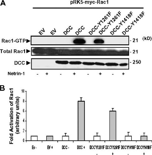 Figure 8. DCC phosphorylation on tyrosine 1418 is critical for Netrin-1âinduced Rac1 activation. (A) COS-7 cells coexpressing DCC, Y1261F-, or Y1418F-DCC mutants together with Myc-Rac1 protein were or were not treated with Netrin-1 for 5 min. The GTP-loaded Rac1 were pulled down from the cell lysates using GST-Cdc42/Rac interactive binding domain-Pak1 fusion protein. The proteins from the pull-down and from the total cell lysate were analyzed by Western blot using anti-DCC antibodies and anti-Myc antibodies to detect both Rac1-GTP and the total Rac1. (B) Quantitative analysis of Rac1 activation by DCC and DCC tyrosine mutants after Netrin-1 treatment (n = 5). Error bars represent SD. |