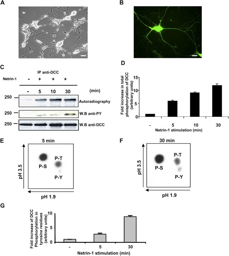 Figure 1. DCC is rapidly phosphorylated in vivo upon Netrin-1 stimulation in embryonic rat CN. (A) Phase-contrast image of E13 rat CN 72 h after plating on laminin. Bar, 40 μm. (B) Immunofluorescence of CN with anti-DCC antibodies showing DCC expression in the cell bodies and along the axons. Bar, 20 μm. (C) E13 rat CN labeled with [32P]orthophosphate for 2 h were either stimulated or not with Netrin-1 for 5, 10, and 30 min. Endogenous DCC was immunoprecipitated (IP) from the cell lysates. The radiolabeled proteins were subjected to SDS-PAGE and identified by autoradiography. The membrane was immunoblotted with anti-pY and anti-DCC antibodies to show the total amount of DCC. (D) Quantitative analysis of the phosphorylation level of DCC after Netrin-1 stimulation of rat CN. Fold increase in total phosphorylation of DCC was determined by densitometry (n = 3). Error bars represent SD. (E and F) The bands corresponding to phosphorylated DCC obtained after 5 min (E) or 30 min (F) of Netrin-1 stimulation were subjected to a phospho–amino acid analysis. (G) Quantitative analysis of DCC phosphorylation on tyrosine residues, using the method described in D (n = 3). Error bars represent SD. |