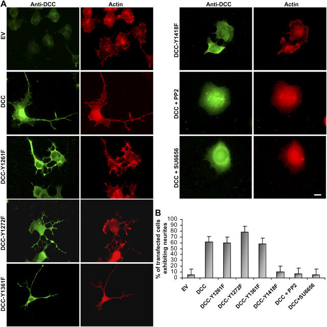 Figure 7. DCC phosphorylation on tyrosine 1418 is critical for neurite outgrowth in N1E-115 cells. (A) Immunocytochemistry of N1E-115 cells expressing DCC, Y1261F-, Y1272F-, Y1361F-, or Y1418F-DCC mutant proteins. The cells were costained with anti-DCC antibodies and with rhodamine-conjugated phalloidin to stain F-actin. Cells expressing DCC were treated with either PP2 or SU6656. Bar, 20 μm. (B) Quantitative analysis of the percent transfected N1E-115 cells exhibiting neurites shown in A (n = 4). The percent transfected N1E-115 cells exhibiting neurites was determined by counting >100 expressing cells exhibiting at least one neurite per cell. A neurite was defined as a process that measured at least the length of one cell body. Error bars represent SD. |