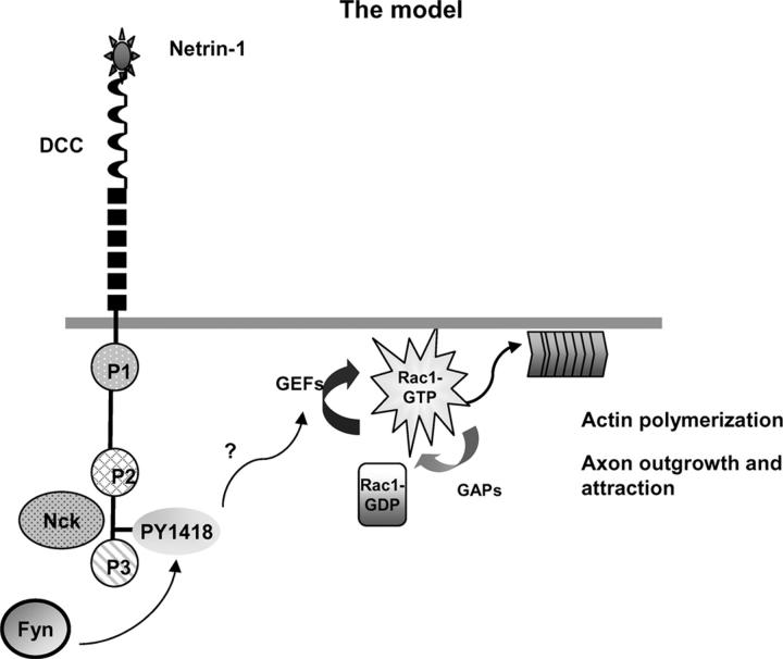 Figure 9. The model. Netrin-1 binding to DCC induces a rapid phosphorylation of Y1418 in the vicinity of the P3 region by Fyn. This primary event might initiate directly or indirectly the activation of a specific unknown guanine nucleotide exchange factor (GEF) that activates Rac1, leading subsequently to actin assembly at the plasma membrane, axon outgrowth, and attraction. |