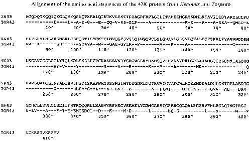 Xenopus (XN 43) sequence is shown by the one-letter amino acid notation. Identical residues in the Torpedo (TOR 43)