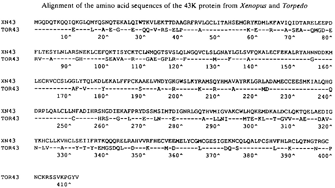 Fig. 2. Alignment of the amino acid sequences of the Xenopus laevis and Torpedo californica 43K proteins. The