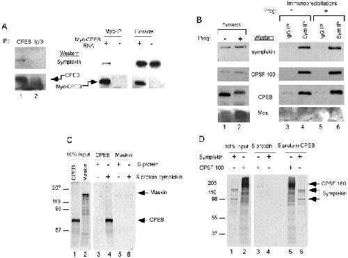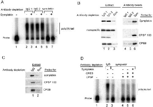 (C) Extracts depleted with symplekin antibody or control IgG were probed for symplekin, CPSF100, and CPEB.