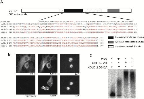 (B) Immunostaining of Xenopus XTC cells shows the cytoplasmic localization of xGLD-2. The cells were also immunostained for α-tubulin and costained with DAPI.