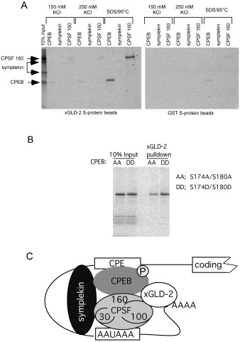 (C) Model of interactions among CPEB, CPSF, symplekin, and xGLD-2. P refers to phosphorylated CPEB serine 174.
