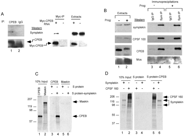 (B) Extracts from oocytes that had been incubated in the absence or presence of progesterone were subject to immunoprecipitation with symplekin antibody or control IgG. Western blots of both the immunodepleted extracts and the immunoprecipitated complexes were probed for symplekin, CPSF100, CPEB, and, as a negative control, mos.