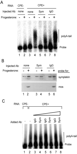 (C) Egg extracts were mixed with increasing amounts of IgG or symplekin antibody and then primed with radiolabeled RNA probes containing or lacking a CPE. The RNA was analyzed as in (A).
