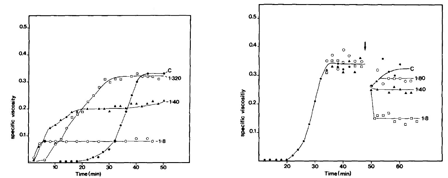 was added in various molar ratios (indicated). The time of addition is marked by an arrow. The change in viscosity was measured using