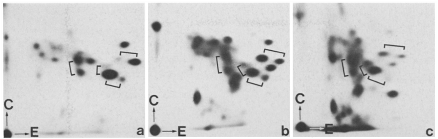 Figure 6. Peptide maps of polypeptides reacive with antibodies against the actin-modulating Mr ~ 93,000 protein from Xenopus laevis