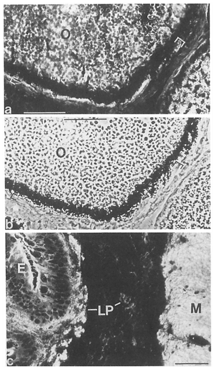 of Xenopus laevis oocytes (a and b) and intestine (c). The sections were fixed with 10% formaldehyde and treated with antibodies