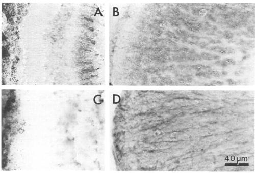 Fig. 5. Comparison of GFAP-Iike (A,B) and vimentin-like (C,D) immunoreactivities in frozen sections from the retina (A,C) and lateral