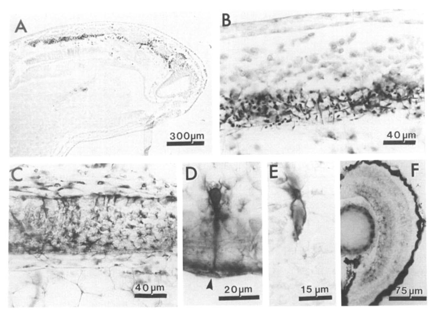(2). B: XNF-M antibody immunoreactivity in cell bodies and axons of Rohon-Beard neurons in the dorsal spinal cord (arrowheads)