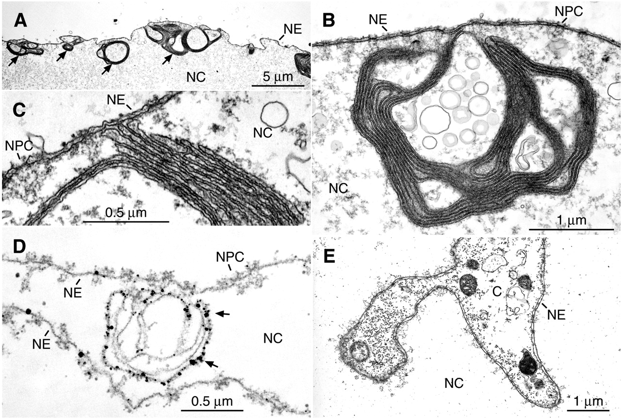 Fig.3. Electron microscopy of lamin-induced intranuclear membrane structures. (A-E) EM sections of isolated oocyte nuclei are shown. Oocytes were injected with RNA encoding lamin B2 (A-D) or lamin B2-SaaX (E). Nuclei were isolated and processed for electron microscopy. Sections were stained with uranyl acetate and lead citrate (A-C,E) or processed for pre-embedding immunoelectron microscopy (D). Lamin B2 was detected with mAb L7-8C6 and nanogold-coated secondary antibody. Arrows in A indicate membrane arrays attached to the nuclear envelope. Arrows in D indicate gold particles decorating the outer membrane cisternae of a lamin B2-induced membrane array. C, cytoplasm; NC, nucleoplasm; NE, nuclear envelope; NPC, nuclear pore complex. Bar, 5 μm (A); 1 μm (B,E); and 0.5 μm (C,D).