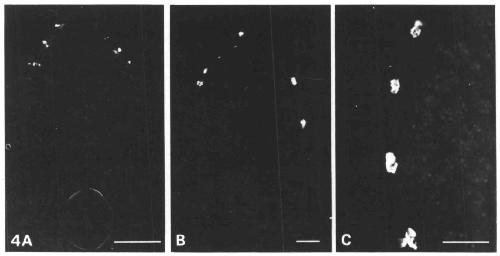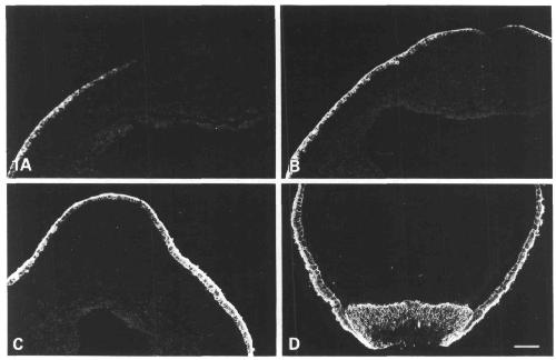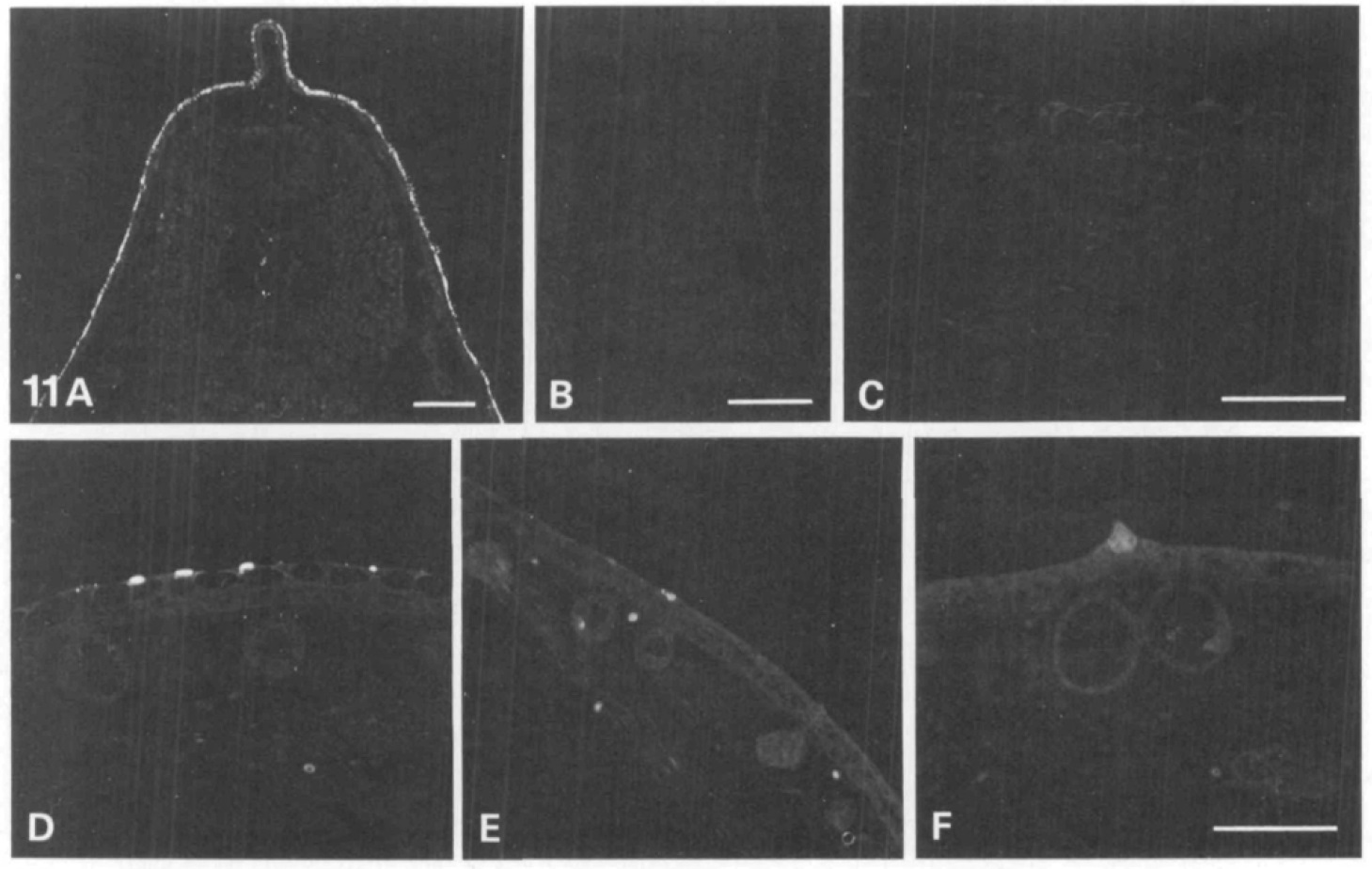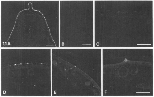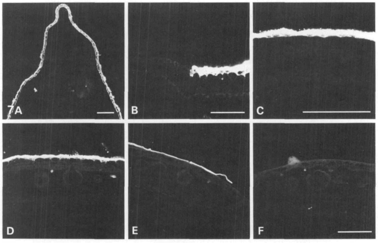 were stained with XEPI-4 and FITC-conjugated rabbit antimouse IgG. (A) Stage 28; (B,C) stage 36. Bar, 100um