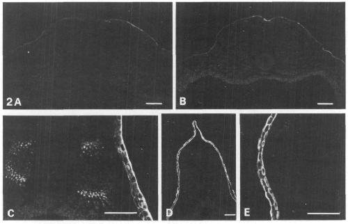 sections were stained with XEPI-1 (A), -2 (B), -3 (C), -4 (D). or -5 (E) and FITC-conjugated antimouse IgG. C and D