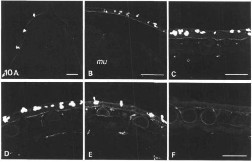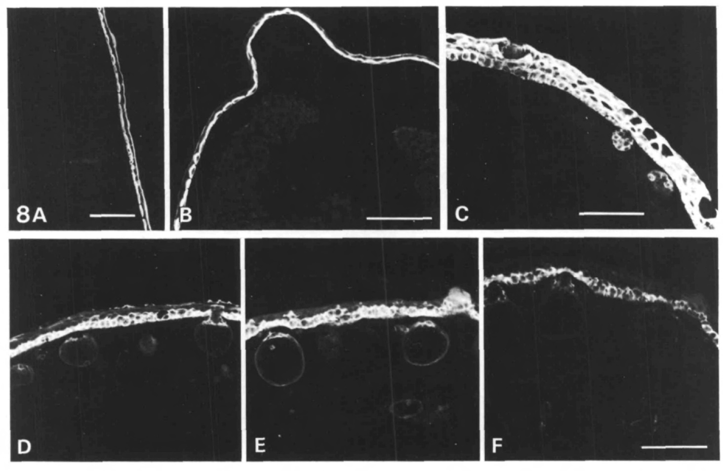 were stained as described in Fig. 2. C-F were dorsal epidermal sections. (A) Stage 40; (B) stage 46; (C) stage 58;