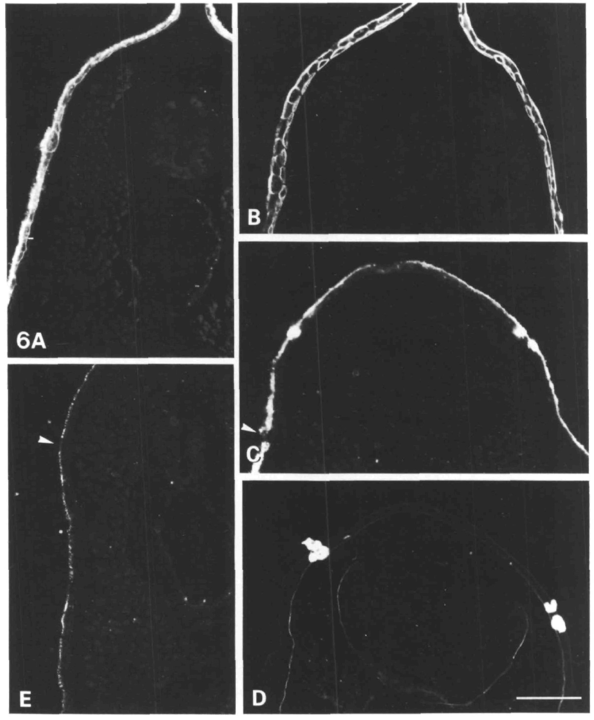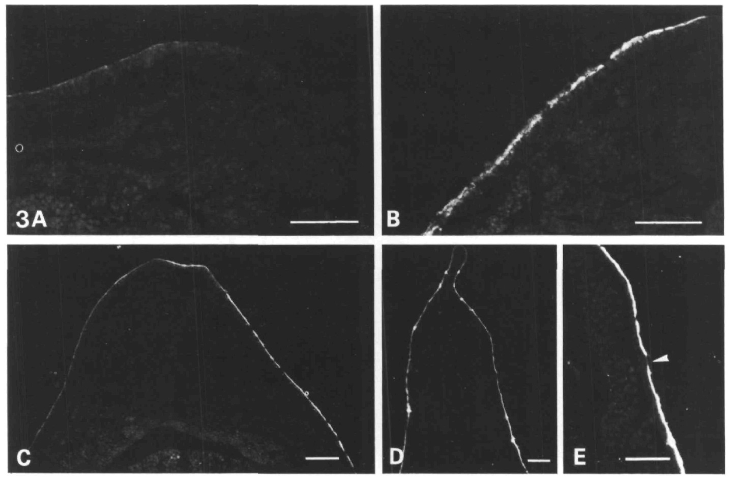 XEPI-3 and FITC-conjugated rabbit antimouse IgG. (A) Stage 16; (B) stage 22; (C) stage 24; (D,E) stage 36. One of
