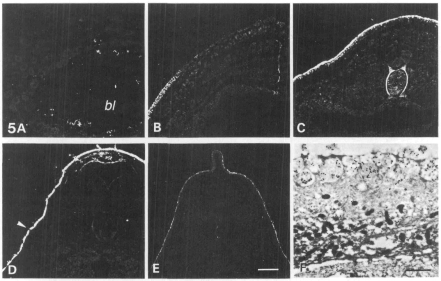 (B) stage 13; (C) stage 20; (D) stage 28; (E) stage 40. (F) Ultrastructural localization of the XEPI-5 antigen at stage 41