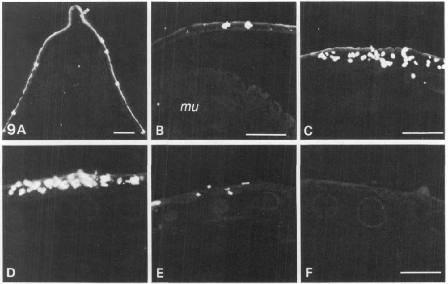 Fig. 9. Expression of the XEPI-3 antigen before and during metamorphosis. Transverse polyester wax sections were
