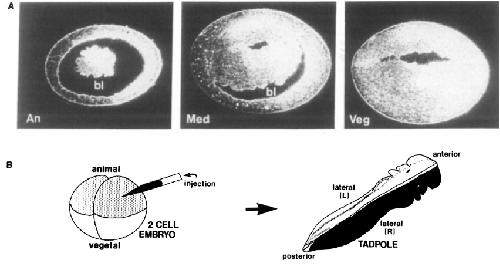 (A) 32P-labeled Xhox-1A mRNA was injected into the marginal region of one blastomere at the two-cell stage. Embryos were allowed to develop to the gastrula stage and were then fixed, horizontally sectioned, and autoradiographed. The grains detected on the uninjected side of the embryo are the result of intercellular movement and reincorporation of radioactive nucleotides produced by degradation of injected RNA (see Figure 1). This is insignificant in the highly cellularizad animal (An) and medial (Med) regions. Autoradiography can therefore be used to visualize injected RNA in these areas of the gastrula, despite the fact that 50% has been degraded by this stage (Figure 1). There is some movement of degradation products in the less cellular vegetal (Veg) regions. In some cases, as shown here. diffusion of RNA throughout the injected blastomere is extensive, resulting in half of the gastrula being labeled. bl is the blastocoel.
