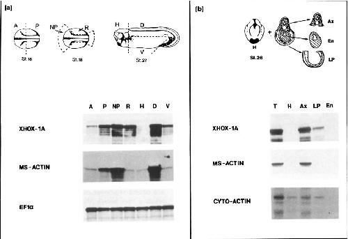 Embryos were separated into the sections indicated, total RNA was extracted, and then analyzed for the presence of endogenous Xhox-IA mRNA by RNAase protection. Probes for EFla (a translation elongation factor; see Kintner and Melton, 1987) and cytoskeletal actin were used to control for RNA recovery. Similarly, a probe for muscle-specific actin was used to control for contamination of sections with muscle. (a) Examination of Xhox- 1A localization in the principal axes of the early embryo. A is anterior, P is posterior, NP is the neural plate (containing both the neural ectoderm and the underlying mesoderm), H is the head, 0 is dorsal, and V is ventral. Note that Same muscle contaminates the R, H, and V samples. Higher resolution dissections were performed in (b). (b) Dissections to separate the axial structures from the lateral mesoderm and endoderm. T is the total embryo, H is the head, Ax is the dorsal axial structures, En is the endoderm, and LP is the lateral plate mesoderm and ventral ectoderm. The poor recovery of RNA in the endoderm sample is due to these cells being large and filled with yolk granules. They contain less cytoplasm and RNA.