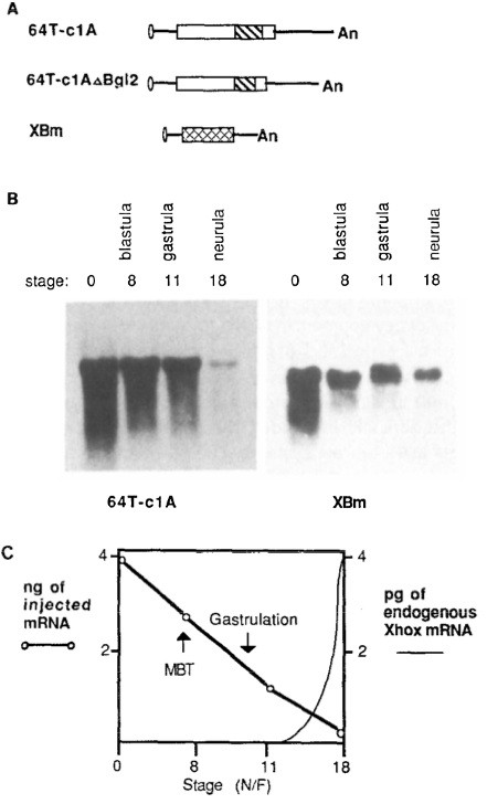 (B) Northern blot analysis of RNA from embryos injected with either 64T-clA or XBm RNA extracted at different stages of development. The injected RNAs were detected on Northern filters with nick-translated Xhox-IA or globin DNA probes. Stages are those specified by Nieuwkoop and Faber (1956).