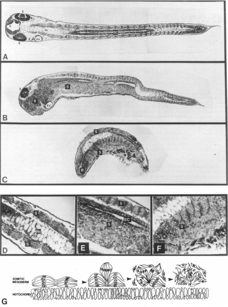 Figure 4. Histological Examination of Normal and Xhox-IA Injected Embryos at the Tailbud Stage (A) Horizontal section of a normal embryo at the level of the notochord and spinal chord. (8) Horizontal section of a Xhox-IA injected embryo at the level of the spinal chord and brain. (C) Horizontal section of a severely kinked and stunted Xhox-IA injected embryo at the level of the brain and notochord. (0) A 2.5x enlargement of a part of the normal embryo shown in (A). (E) A 2.5x enlargement of a part of the Xhox-IA injected embryo in (8) showing the loss of somite units in the lower or injected side. (F) A 2.5x enlargement of a part of the Xhox-1A injected embryo in (C) showing the somite-like units interdigitated between the notochord-proximalsomites on the lower or injected side (see text). (G) Diagram of the differences in the severity of the Xhox-1A phenotypes from normal on the left to totally chaotic on the right. B is the brain, E is the eye, EV is the ear vesicle, NC is the notochord, S is the somitic mesoderm, and SC IS the spinal cord.