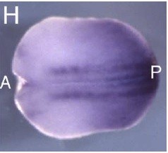 Fig. 3. In situ hybridization analysis of fullback RNA expression at gastrula and neurula stages. In situ hybridization was performed on intact (A,C,E,H) or bisected (B,D,F,G) albino Xenopus embryos. Dashed lines in panel (E) indicates the plane in which the embryo in (F) was cut in half. (A) Vegetal view of an early gastrula (stage 10). (B) Bisected embryo at early gastrula stage 10. (C) Posterior view of an embryo at mid-gastrula stage 11.5. (D) Embryo bisected sagittally at mid-gastrula stage 11.5. Note staining in involuted mesoderm. (E) Dorsal view of an embryo at early neurula stage 13. Arrows indicates stripes of staining on the dorsal side and dashed line indicates plane of section of embryo in (F). (F) Bisected embryo at early neurula stage 13. (G) Embryos bisected sagittally at early neurula stage 13. Note posterior staining. (H) Dorsal view of an embryo at late neurula stage 18. For all images, Vg, vegetal; D, dorsal; V, ventral; A, anterior; P, posterior.