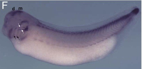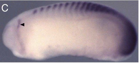 ngfr (nerve growth factor receptor) gene expression in bisected Xenopus laevis embryo, assayed via in situ hybridization, NF stage 24, lateral view, anteriorleft, dorsal up.