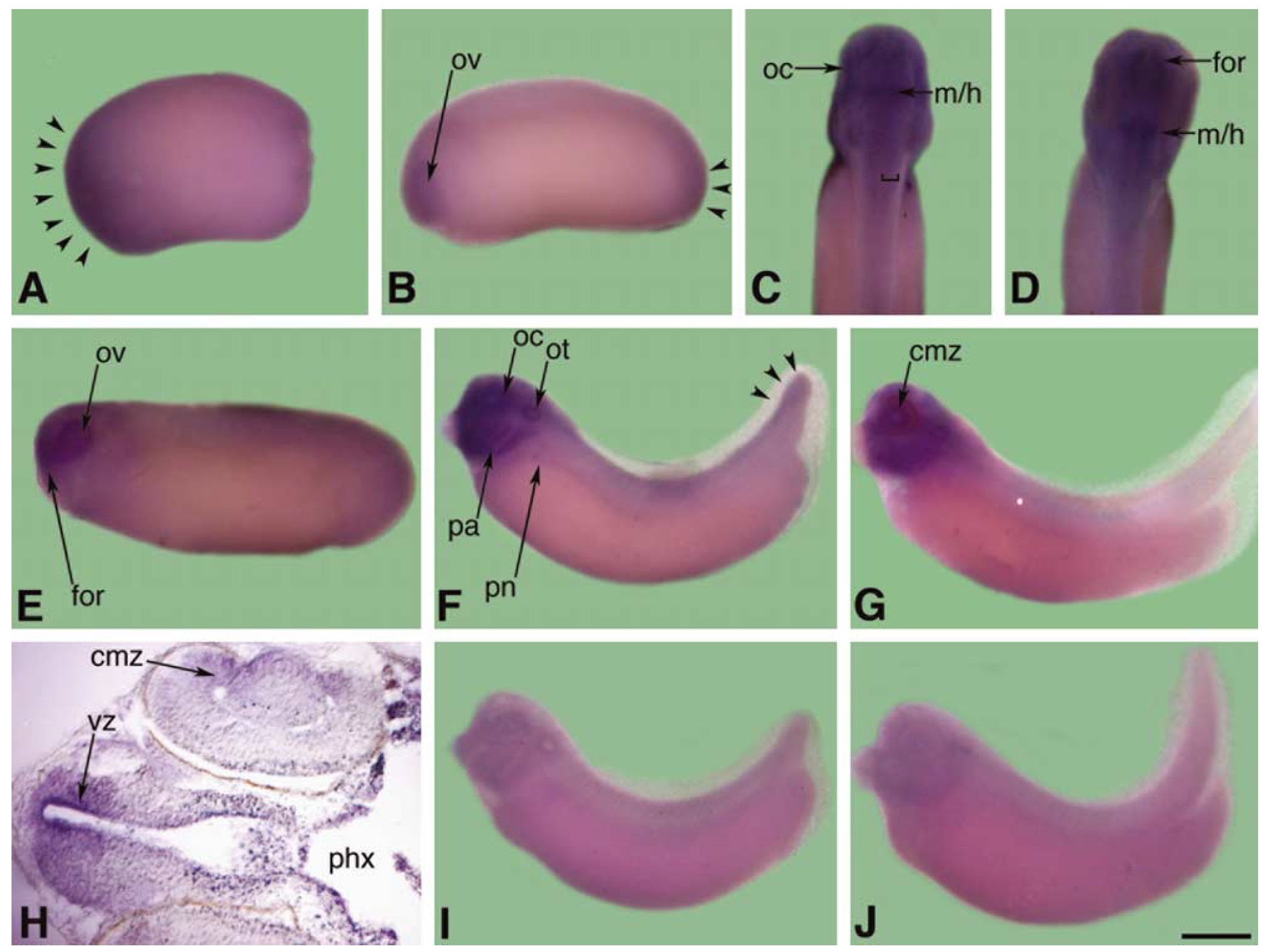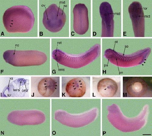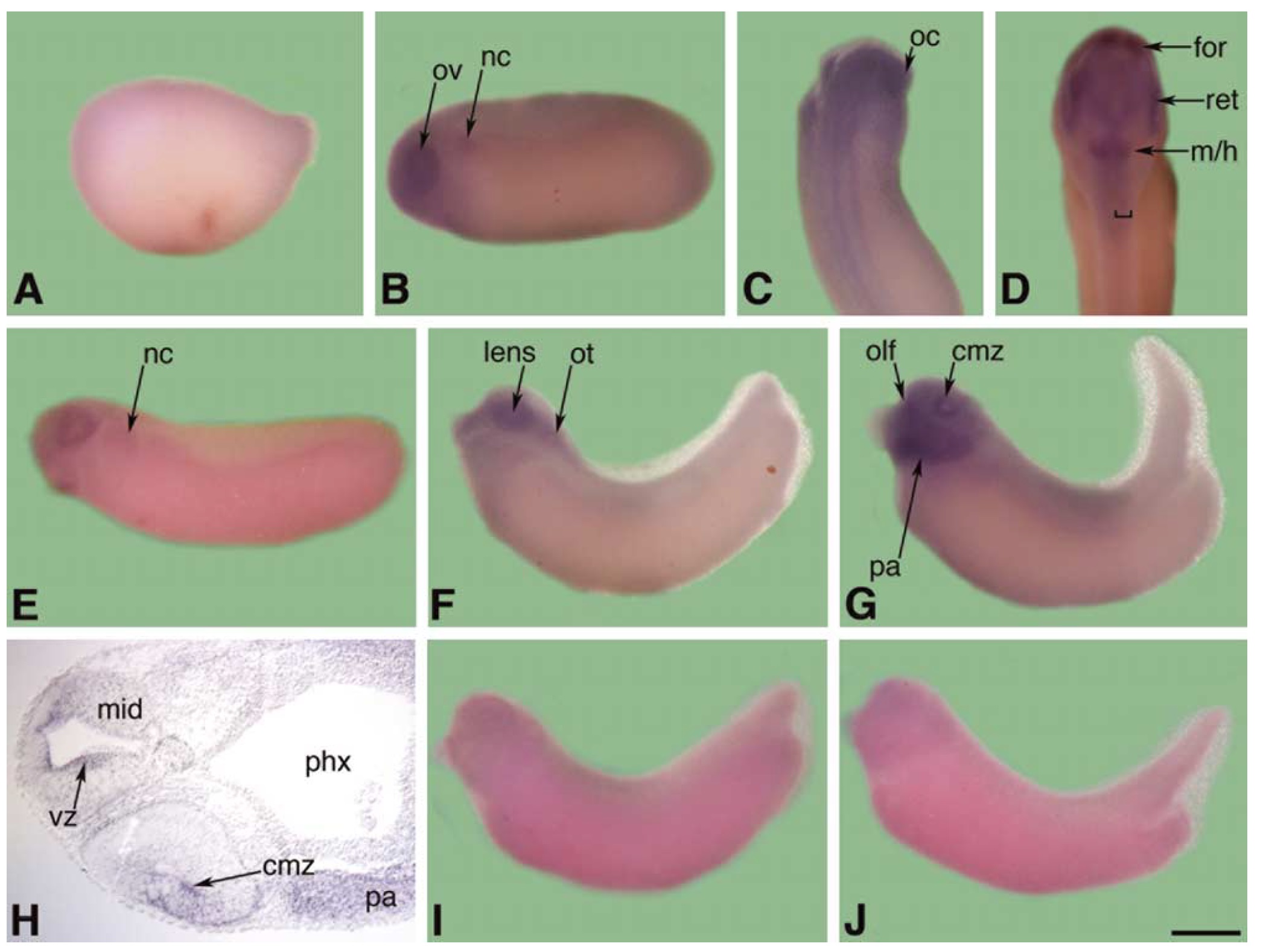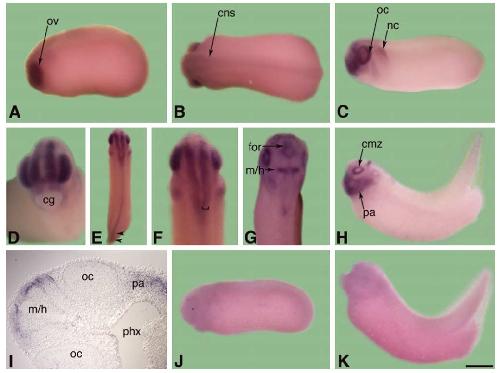of the CNS. Expression can also be seen in the lens, the lining of the pharynx, and the ciliary marginal zone of the retina. (I) Sense control stage 33 embryo. (J)