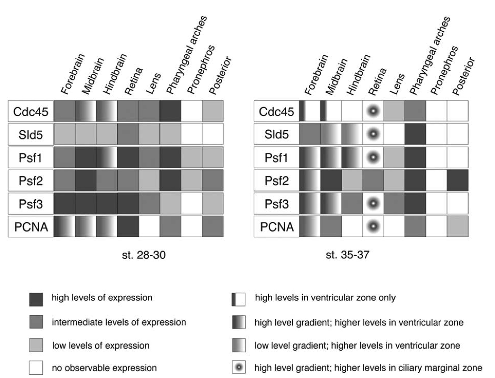 expression of Psf1. (C) Stage 33 embryo. The bracket demarcates the right half of the CNS, and the left margin of the bracket aligns with the inner boundary of