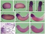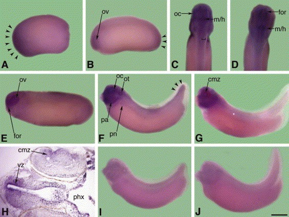Fig. 5. Expression of Psf3. All embryos are oriented anterior to the left and dorsal to the top, except those in (C and D) which are dorsal views oriented anterior to the top. (A) Stage 13 embryo. Arrowheads demarcate anterior and posterior regions of neural expression. (B) Stage 22 embryo. (C) Stage 32 embryo. The bracket demarcates the right half of the CNS, and the left margin of the bracket aligns with the inner boundary of the ventricular zone. (D) Stage 37 embryo. (E) Stage 26 embryo. (F) Stage 32 embryo. (G) Stage 37 embryo. (H) Section through a stage 37 embryo at the level of the hindbrain, with the dorsum oriented to the left. Note the consistent levels of expression in the dorsal CNS compared to Psf1 (Fig. 3H) and Psf2 (Fig. 4I). (I) Sense control stage 30 embryo. (J) Sense control stage 37 embryo. All labels follow that listed in the legend to Fig. 1. The scale bar in G equals 380 mm in (A), 550 mm in (B) and (EâG), (IâJ), 200 mm in (C and D), and 125 mm in (H). |