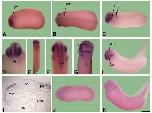 Fig. 1. Expression of cdc45. Embryos in (A) as well as (FâH) are oriented anterior to the left and dorsal to the top. (A) Stage 13 embryo. Arrowheads demarcate