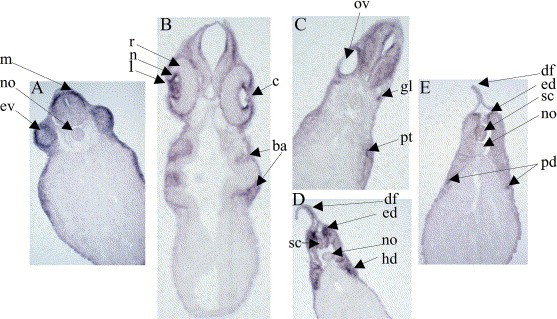 Fig. 5. Cryostat sections showing the internal localisation of transcripts of X-CypA. Embryos at stages 26 (A), 33 (Bâ D) and 39 (E) were subjected to whole-mount in situ hybridisation, allowed to over-stain in developing solution, and then embedded in acrylamide. Blocks were frozen in isopentane and sectioned at 20â î¼m. Clear staining is observed in the sensory organs (eyes, otic vesicle) (panels Aâ C) and in the branchial arches (B). Some staining is observed in the central nervous system (A) and also in the peripheral nervous system (ganglion and spinal cord) (panels Câ E). The developing somites are also stained (panels D and E) as are the pronephric tubules (C) and duct (E). ba, branchial arches; c, cornea; df, dorsal fin; ed, epaxial dermomyotome; ev, eye vesicle; gl, ganglion; hd, hypaxial dermomyotome; l, lens; m, mesencephalon; n, neurons; no, notochord; ov, otic vesicle; pd, pronephric duct; pt, pronephric tubules; r, retina; rl, retinal layer; sc, spinal cord.