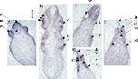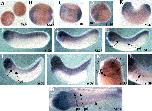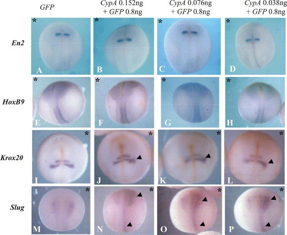 Fig. 6. Analysis of the effects of X-CypA over-expression on the expression of neural markers by in situ hybridisation. Embryos were co-injected into one cell of the 2-cell stage with 0.152, 0.076 or 0.038â ng X-CypA and 0.8â ng GFP mRNAs and cultured to stage 19. The embryos were then subjected to in situ hybridisation using En2, HoxB9, Krox20, Slug probes. No obvious effects on the expression of En2 or HoxB9 were observed. However, the expression of Krox20 and Slug were affected by the misregulation of X-CypA. Extension and disorganisation of the neural crest domain of Krox 20 is noticeable (compare Jâ L to I), the expression of Slug mRNA is increased on the injected side (compare M to Nâ P). An asterisk indicates the injected side. Arrowheads indicate altered expression pattern.