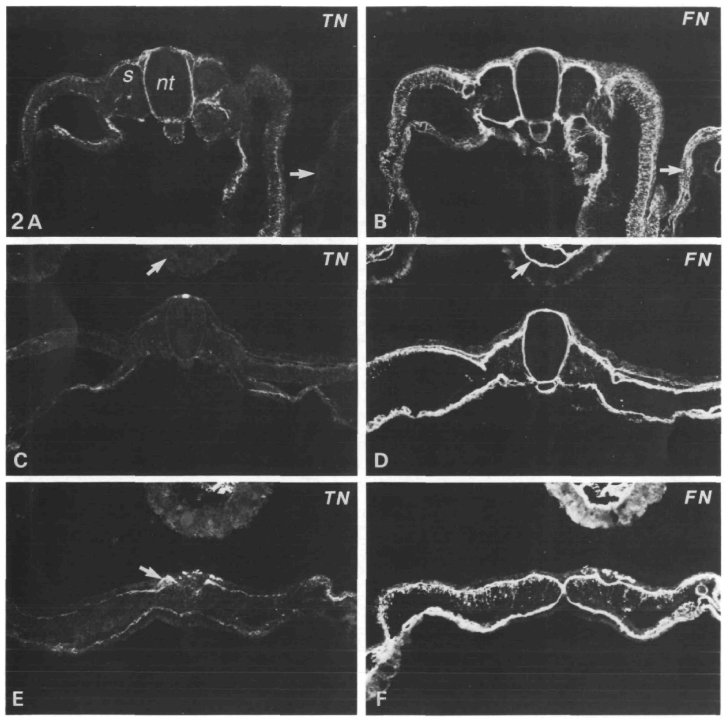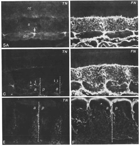 (TN) and fibronectin (FN). See small arrows in Fig. 4 for orientation. (A) In frontal sections through the dorsal part of