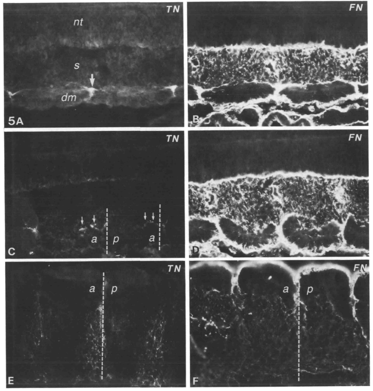 p, posterior. (F) In contrast to the anti-tenascin staining, anti-fibronectin stains both the anterior (a) and posterior (p)