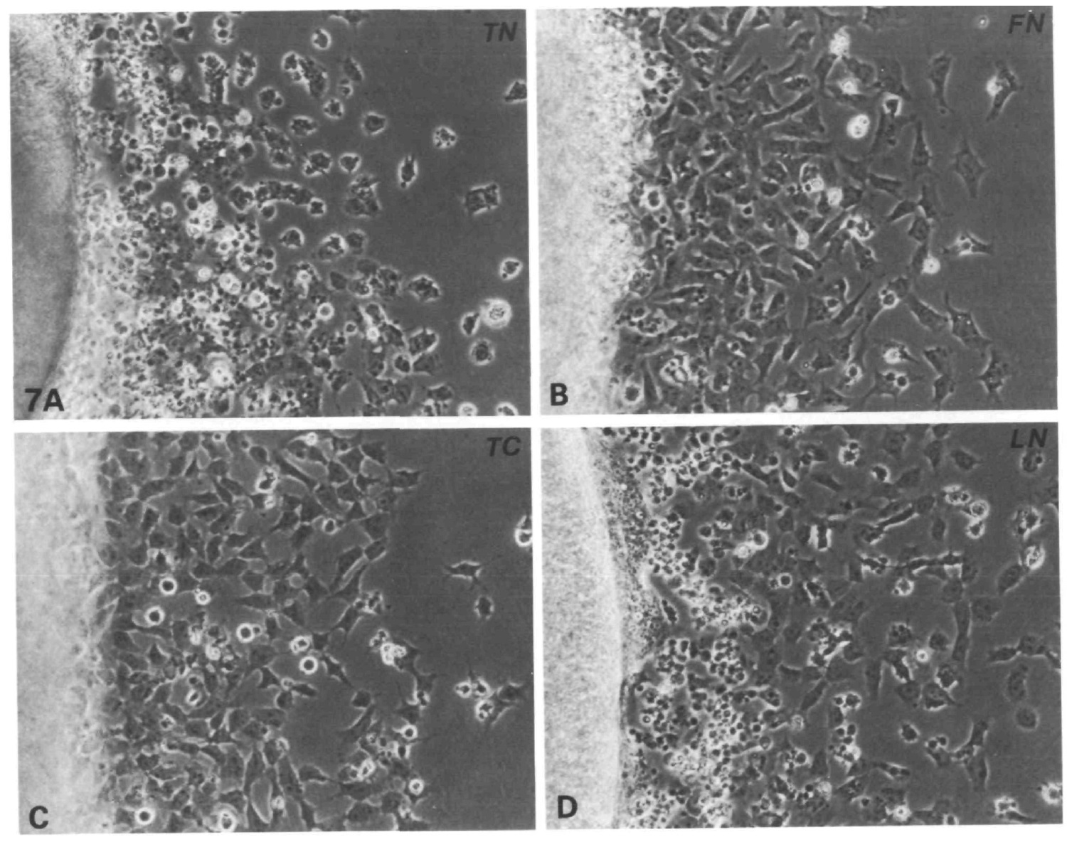 Fig. 7. 24h-old primary cultures of quail neural crest cells on tissue culture plastic uncoated (TC) or coated with