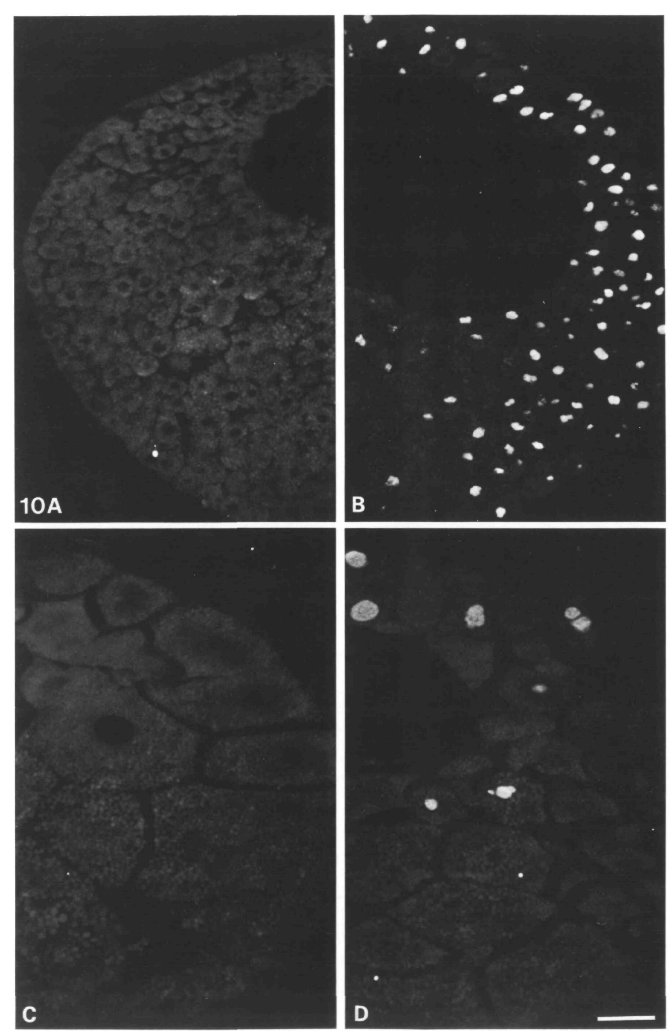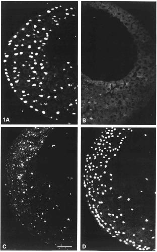 Fig. 2. Nucleocytoplasmic distribution of nucleoplasmin in embryos of X. laevis. Embryos after the 7th (A,B), 11th